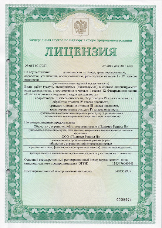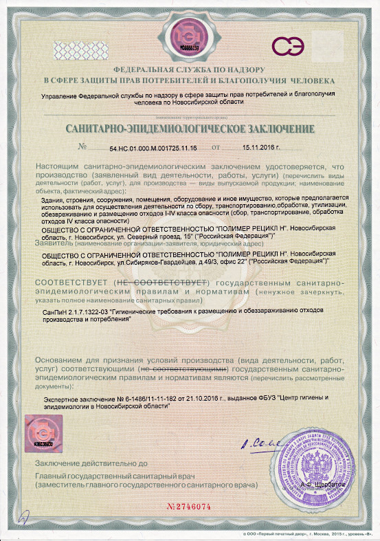 Соответствие государственным санитарно-эпидемиологическим правилам и нормативам зданий, сооружений, помещений, оборудования и иного имущества ООО «Полимер Рецикл Н» (СанПиН 2.1.7.1322-03 «Гигиенические требования к размещению и обеззараживанию отходов производства и потребления»), используемого в деятельности при обращении с твёрдыми коммунальными отходами удостоверяется Санитарно - эпидемиологическим заключением № 54.НС.01.000.М.001725.11.16 от 15.11.2016г., выданным Федеральной службой по надзору в сфере защиты прав потребителей и благополучия человека. |