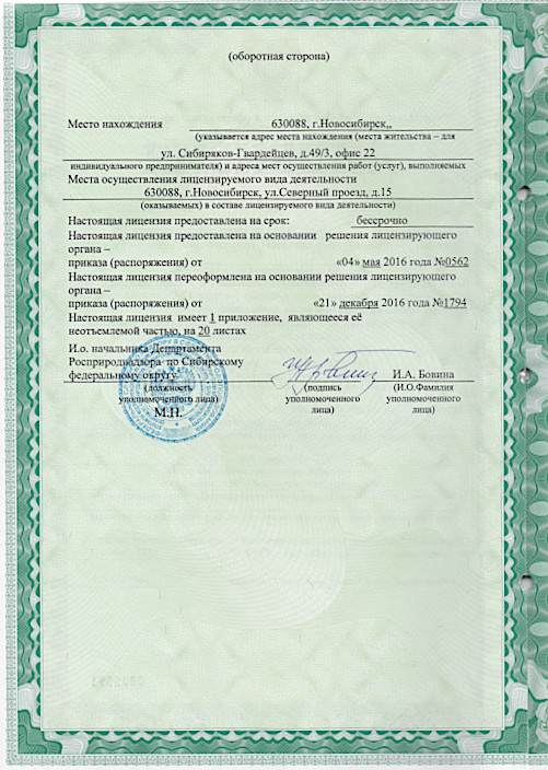 Соответствие деятельности предприятия по обращению с твёрдыми коммунальными отходами (сбор, транспортирование, обработка, утилизация, обезвреживание, размещение отходов I-IV классов опасности) подтверждено лицензией № 054 001 70/П от 04 мая 2016 г., выданной Федеральной службой по надзору в сфере природопользования.